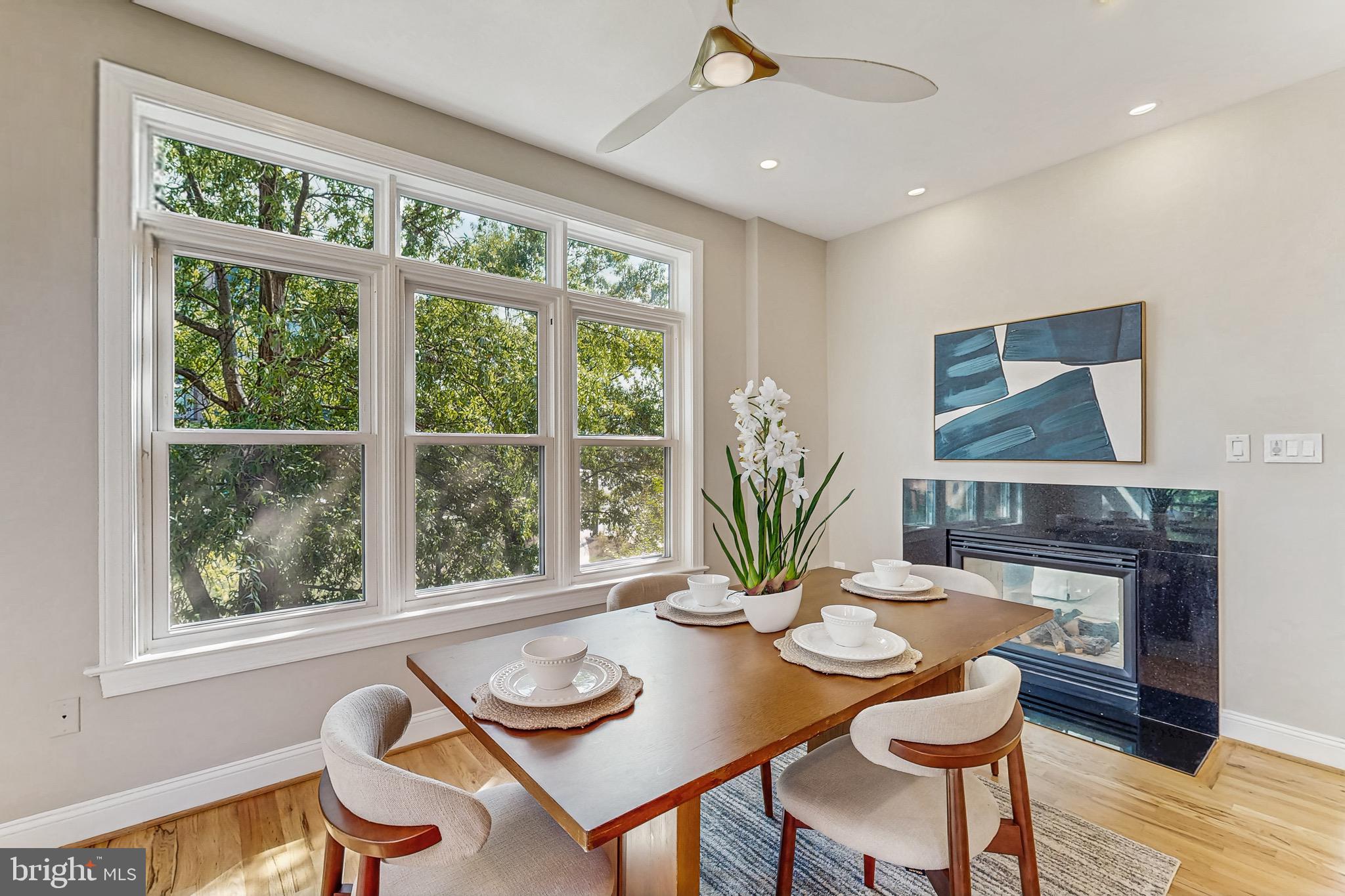 Heading to the third floor, discover your private retreat: a nearly 800 sq. ft. primary suite with new hardwood floors (2022) and a wall of windows (with remote shades for privacy) fill the space with natural light, while a generous seating area can be used as an at-home library and reading area or an at-home office. The spa-like en suite bath features dual vanities with new light fixtures and mirrors, a separate water closet, a soaking Jacuzzi tub, and a walk-in shower. Get ready for work or play with a thoughtfully designed, expansive walk-in closet featuring built-in shelving, hanging space, and drawers to perfectly organize clothing, shoes, and accessories. The 4th floor features 2 spacious bedrooms with hardwood floors and large closets as well as a recently updated full bath. Both bedrooms overlook the sweet pocket park below. A full size W/D completes the 4th level.